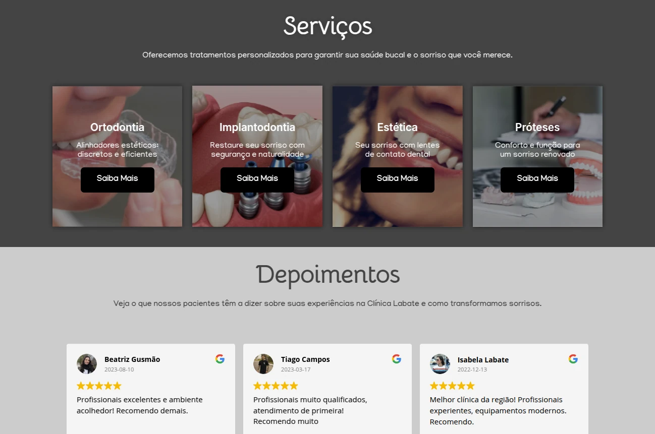 Site para clínica odontológica localizada em Cotia (SP), com páginas exclusivas para cada especialidade (como ortodontia e implantodontia).
