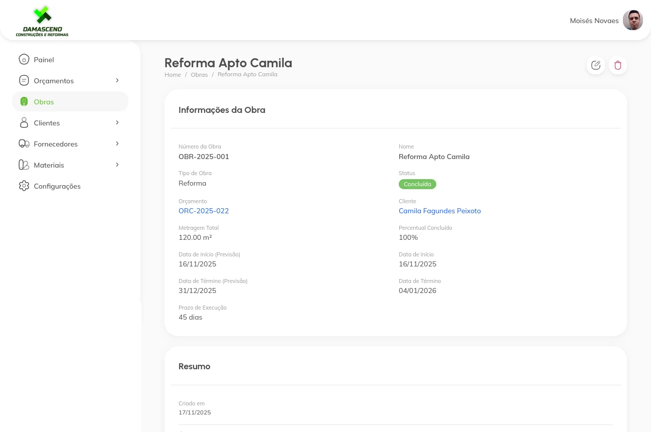 Sistema desenvolvido para gestão completa de obras, incluindo controle de clientes, orçamentos, materiais e acompanhamento em tempo real.